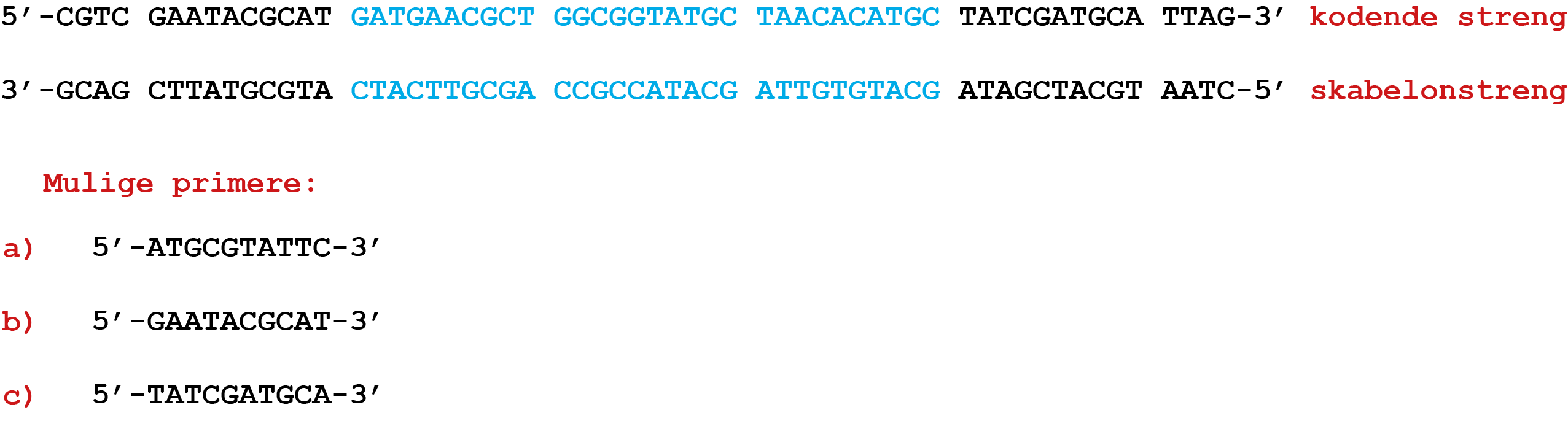 2. Argumentér for hvilken af de viste primere, som kan bruges til at sekventere det udsnit af genet, der er markeret med blåt på figur 3.2.