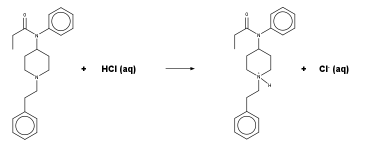 Fentanyl er en base, som har molarmassen 336,48 g/mol. Mængden af Fentanyl kan bestemmes ved titrering med saltsyre, hvor følgende reaktion sker: