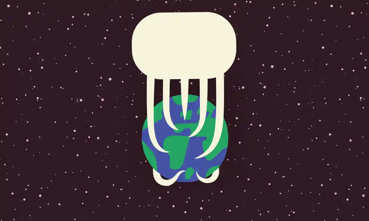 Image credit: Illustration. Miguel Montaner. From: Jacob Mikanowski. “Behemoth, bully, thief: how the English language is taking over the planet”. The Guardian website, January 19, 2022, viewed October 2022. (www.theguardian.com)