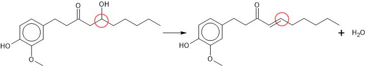 | Gingeroler findes blandt andet i ingefær, og den stærke smag af ingefær skyldes stoffets binding til smertereceptorer på tungen. Når man tørrer ingefær omdannes 6-gingerol til 6-shogaol. Figur 3.3 viser omdannelse af 6-gingerol til 6-shogaol. 6-shogaol er cirka dobbelt så stærk som 6-gingerol, hvilket er årsagen til at ingefærpulver er stærkere end frisk ingefær. Strukturformler for tre forskellige gingeroler og 6-shogaol ses på figur 3.2 og kan ses her som henholdsvis Marvinsketch- og ChemSketch-fil. |