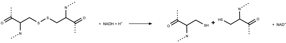 Figur 3.2 Forsimplet reaktionsskema for spaltning af disulfidbinding mellem to cystein-sidekæder indbygget i et protein.