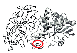 Figur 3.3 Ricin. Til venstre ses B-kæden og til højre A-kæden. Disulfidbindingen er indcirklet med rødt. |