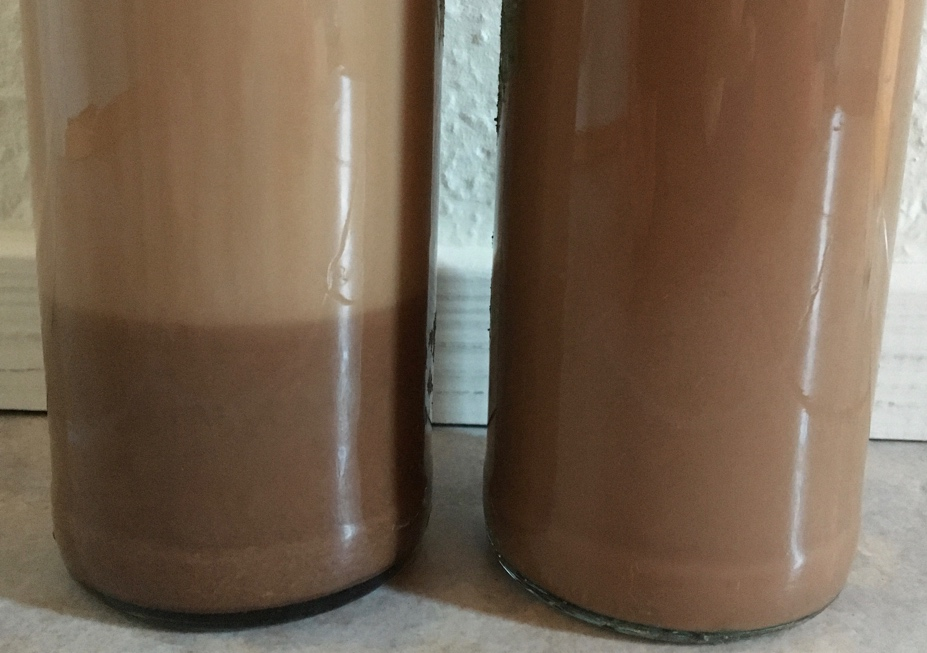 Figur 4.3 Til venstre ses en kakaomælk, som ikke er tilsat stabilisator, og til højre er en kakaomælk, der er tilsat stabilisator.